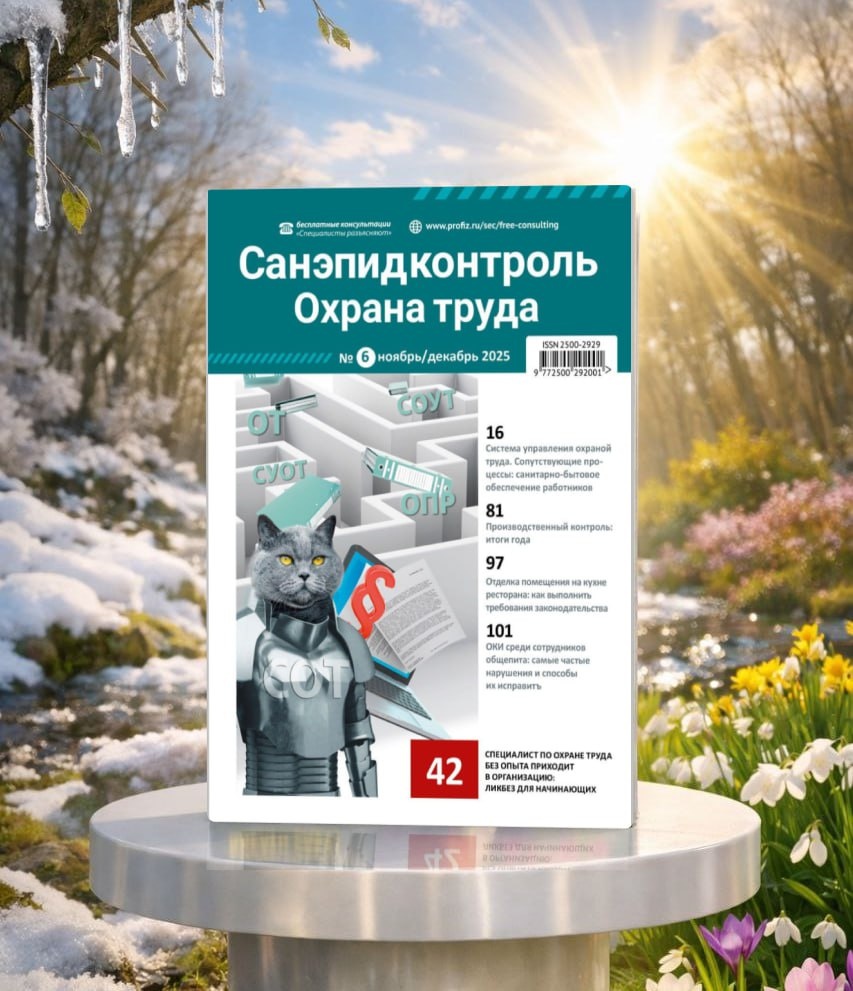 Охрана труда»! В этом номере — курс «молодого бойца» и статья из серии, посвященной выстраиванию СУОТ, всё о новшествах в проведении проверок Роспотребнадзором и в выдаче санитарных заключений, алгоритм действий на случай, если работник не прошел обучение по охране труда, рекомендации по определению холодного периода года для выдачи зимней спецовки со сроками по регионам в свете новых норм по климатологии, чек-листы для самопроверки соблюдения санитарно-гигиенических требований в отделениях реанимации и интенсивной терапии, оперблоке, ЦСО, палатных отделениях и пищеблоке — и это далеко не все материалы номера. 👉Скачать журнал можно по ссылке Полезного чтения!😊