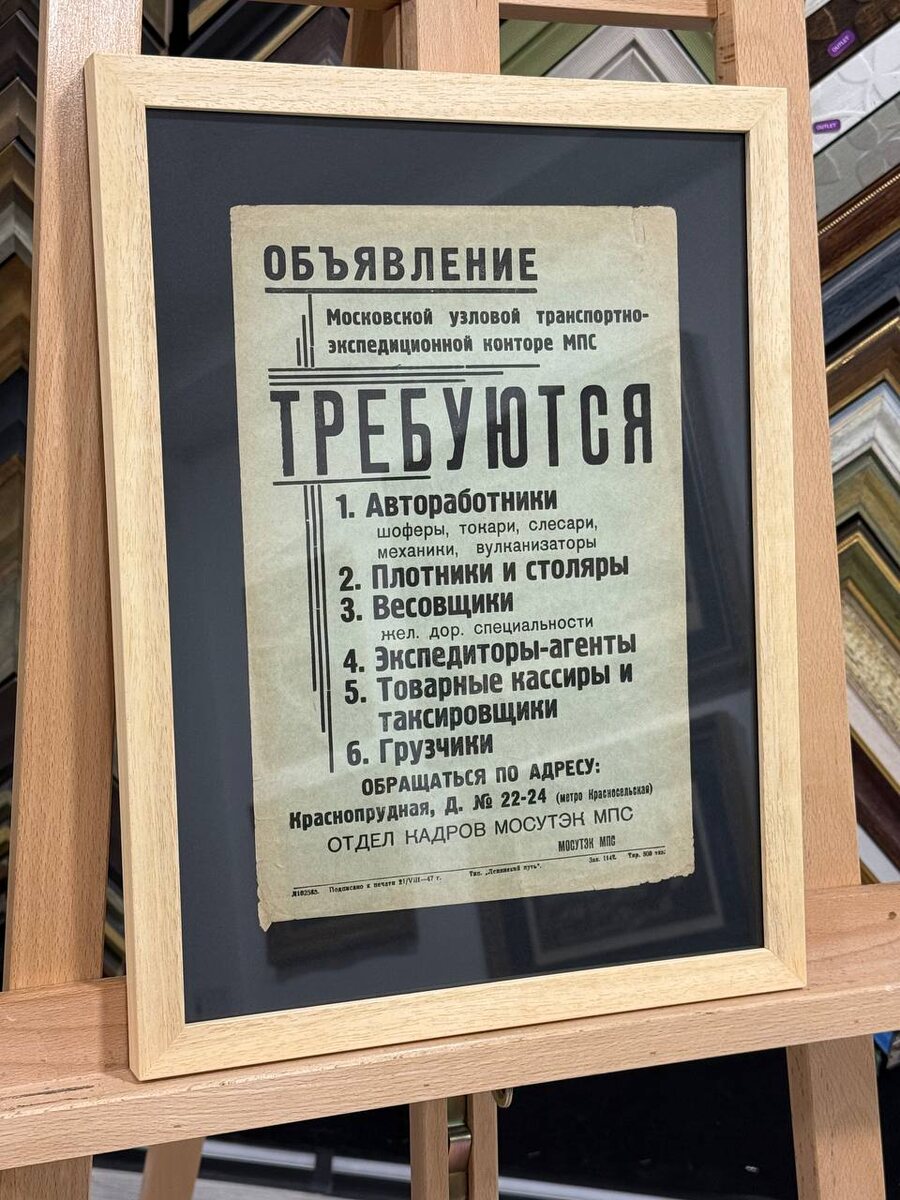 ⏳ И шагнём в совсем другую эпоху — ту, что во многом породила реальность начала 90-х ( см пост выше). 1947 год. Страшная война позади. Впереди — светлое будущее. И очень много работы. Очень. Перед нами — подлинное объявление Московской узловой транспортно-экспедиционной конторы МПС. ТРЕБУЮТСЯ: • автоработники: шофёры, токари, слесари, механики, вулканизаторы • плотники и столяры • весовщики ж/д специальности • экспедиторы-агенты • товарные кассиры и таксировщики • грузчики Адрес: Краснопрудная, д. 22–24 (м. Красносельская) Сухой язык эпохи. Никакого маркетинга. Стране нужны руки. Отдельное удовольствие — рукописный текст на обороте ✍️ Живая интонация 1947 года. Без ретуши. Такие артефакты мы уважаем. Это не просто бумага — это дыхание времени. Оформили бережно: паспарту и деревянный багет. История должна жить достойно 🖼️ ⸻ Арт-мастерская Багетъ — Искусство в каждой детали. 🕰️ 🎯 КОНТАКТЫ: 📍 Москва, Дмитровский пер., 4, стр. 1 🚗 Бесплатная парковка во дворе 🚇 5 мин от м.