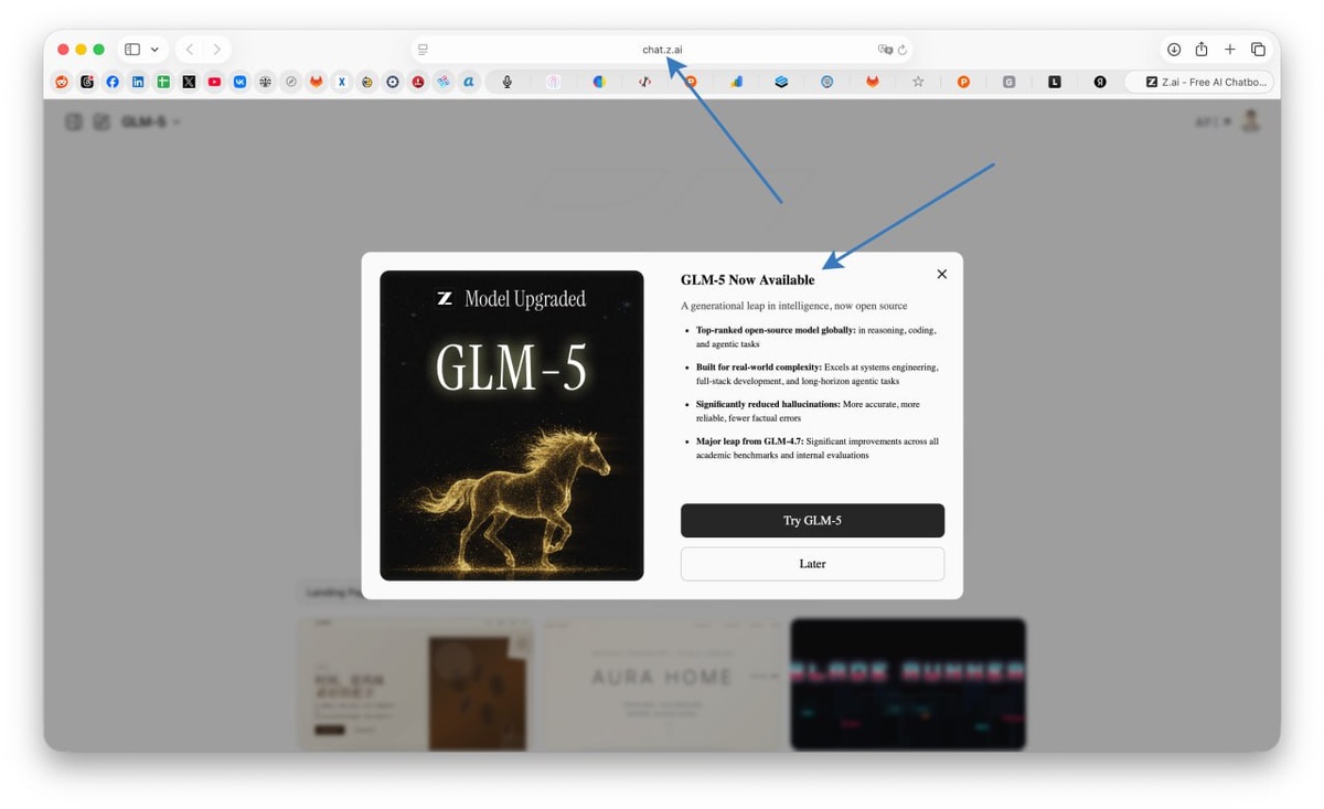 GLM-5 уже доступна и можно бесплатно работать тут https://chat.z.ai. Могучая ИИ, без прокси из РФ вполне себе. Прямо сейчас спрашиваю тупые вопросы :) Русский ИТ бизнес