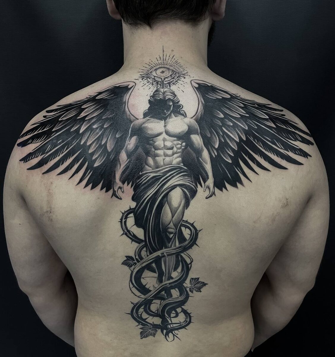 ❕ Представьте: за вашей спиной — крылья. Не метафора, а зримый символ, прорисованный чернилами на коже. Татуировка ангела на спине — один из самых поэтичных и многозначных выборов. Давайте разберём, почему она трогает сердца и как найти свой образ. Что скрывает спина Спина — необычное «полотно»: это зона, которую вы не видите сами, — татуировка становится посланием скорее для мира, чем для себя; её можно скрыть или открыть — игра с тайной; анатомические линии (позвоночник, лопатки, изгибы) задают ритм рисунку: крылья могут «расти» из лопаток, а фигура ангела — следовать контурам позвоночника. Ангелы: коды смысла Образ ангела редко бывает просто декоративным. Вот частые трактовки: Хранитель. Татуировка как амулет: «кто‑то смотрит за мной». Память. Портрет ангела — молчаливый памятник человеку или моменту. Перерождение. Падение и взлёт: после кризиса, потери, перелома. Невинность. Белый цвет, детские черты, нежные позы — попытка удержать чистоту. Борьба. Ангел и демон, меч в р