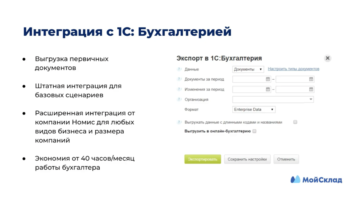 Расчёт простой. При 500 документах в месяц ручной перенос из МойСклад в 1С занимает 40 часов работы бухгалтера. Это деньги на Ctrl+C, Ctrl+V между программами.