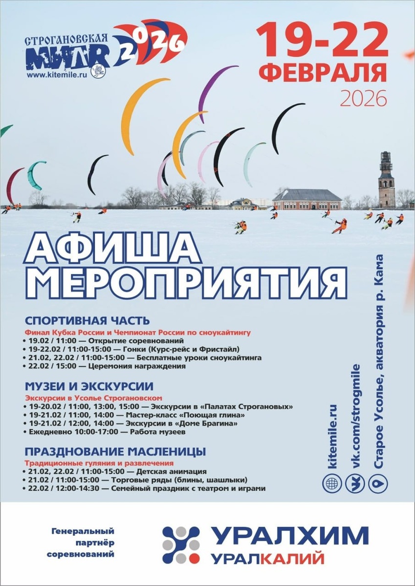 » 😉 Соревнования пройдут с 19 по 22 февраля на акватории реки Кама, напротив музейно-исторического комплекса «Палаты Строгановых». Вас ждут зрелищные гонки, мастер-классы для новичков, интерактивные площадки и экскурсии по музейному комплексу! Открытие соревнований — 19 февраля, 11:00. ✅ Фестиваль организован при поддержке «Уралкалия», входящего в группу «Уралхим».