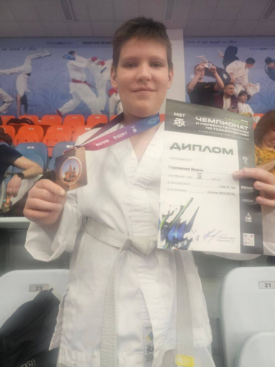 Ученик 4 «Б» класса Мирон впервые принял участие в Чемпионате и первенстве Москвы по тхэквондо — и показал отличный результат — бронзовое место!