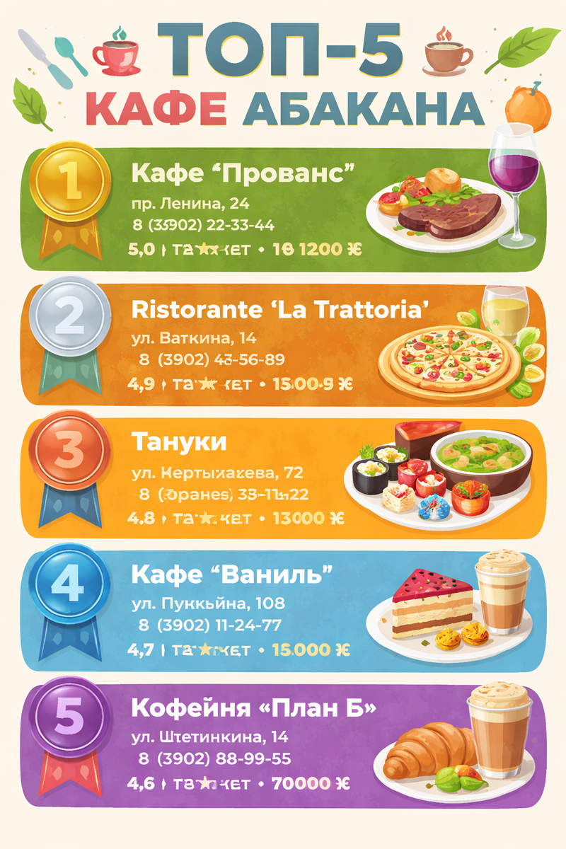 Абакан — город, где можно поесть недорого и вкусно, если знать, куда идти. И где можно заплатить кучу денег и остаться голодным и разочарованным, если довериться только интерьеру. Выбирайте проверенное, читайте свежие отзывы и помните: лучший завтрак — тот, после которого вы не думаете о потраченных деньгах, а просто радуетесь дню.