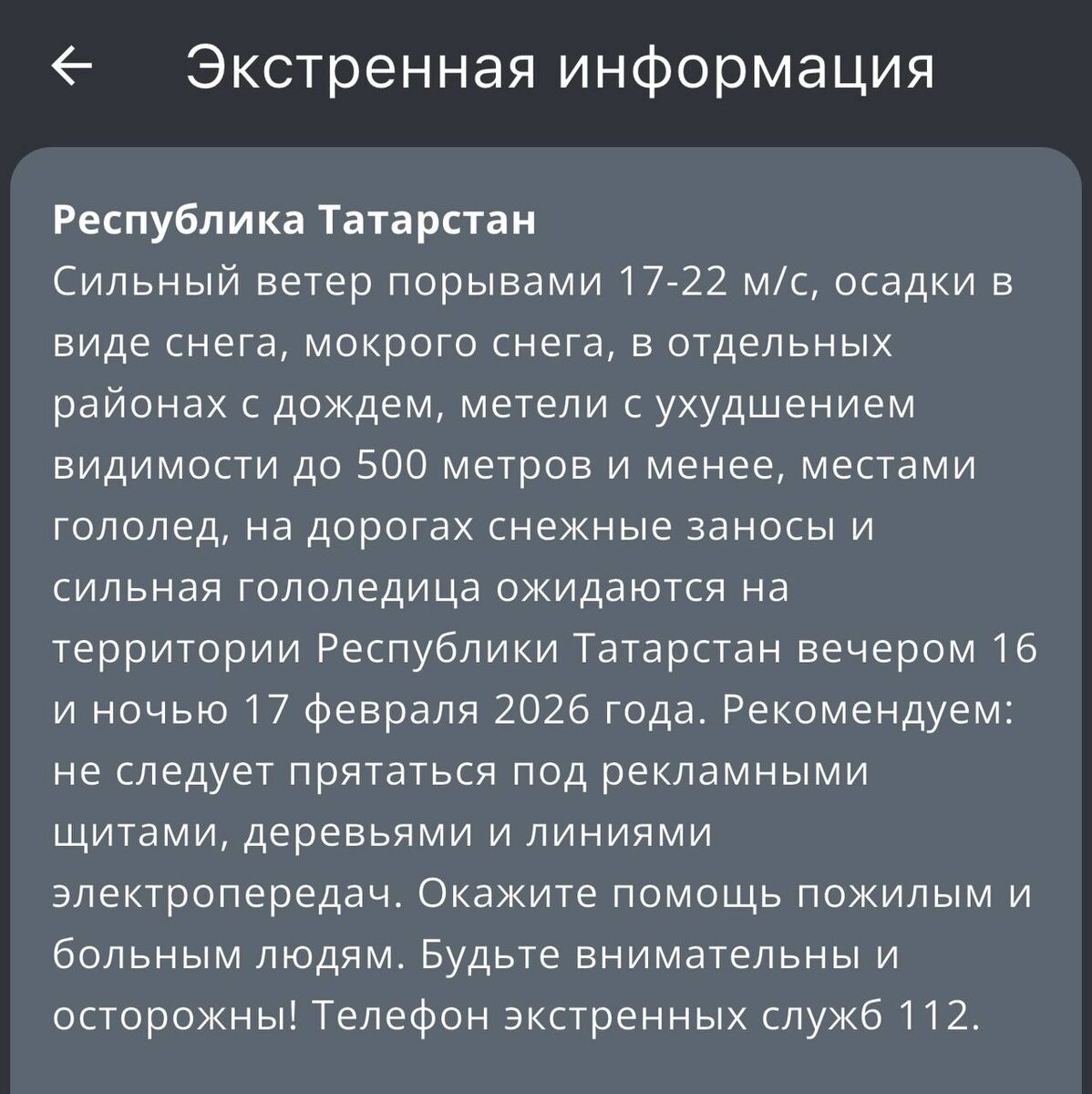 Сегодня вечером и ночью 17 февраля на территории республики ожидается сильный ветер порывами 17-22 м/с, осадки в виде снега, мокрого снега, в отдельных районах с дождем, метели с ухудшением видимости до 500 метров и менее, на дорогах снежные заносы и сильная гололедица. ⭐️ Татарстан News 📲 Татарстан News в MAX