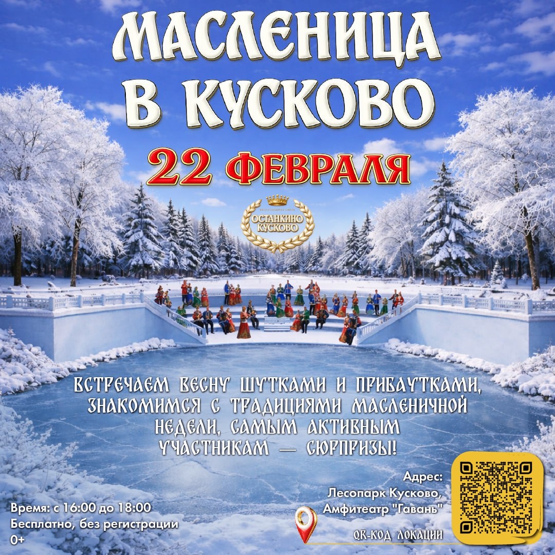 🥞 Дождались! Масленица в Кусково Подробная программа - уже на сайте ➡️ 22 февраля с 16 до 18 профессиональные артисты в игровой форме будут знакомить участников с русскими народными традициями и играми, а также расскажут, как называют каждый день масленичной недели! 0+ Вход свободный, без регистрации 📍Амфитеатр "Гавань" в Лесопарке Кусково: https://yandex.ru/maps/org/amfiteatr/148426286188?si=pttyat4evyw4g5bv96arwpx020 А в Лесопарке Кусково знакомимся с масленичными традициями каждый день ❤️