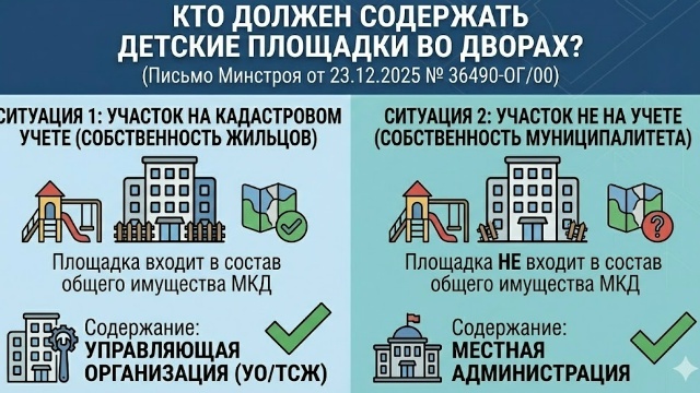 Содержание детских площадок во дворах многоквартирных домов остается серьезной проблемой. От этого напрямую зависит безопасность детей. Поэтому важно определить, кто должен такие площадки содержать. Ответ попытался дать Минстрой в письме от 23.12.2025 № 36490-ОГ/00. Минстрой рассмотрел две ситуации. Первая - площадка находится на земельном участке, который поставлен на кадастровый учет, а значит находится в собственности жильцов. В этой ситуации содержать площадку должна управляющая организация. В этом моменте Минстрой допустил забавное смешение понятий – перепутал понятия "придомовой территории" и "земельного участка под МКД". В чем отличие можно узнать из книги "ЖКХ: вопросы и ответы" Вторая - земельный участок на учет не поставлен, в общую собственность не входит. Тогда собственником участка является муниципальное образование. Поэтому содержать детскую площадку должна местная администрация. Смотрите видео от подписчицы по теме: Кстати, почти все видео на нашем канале теперь выходят