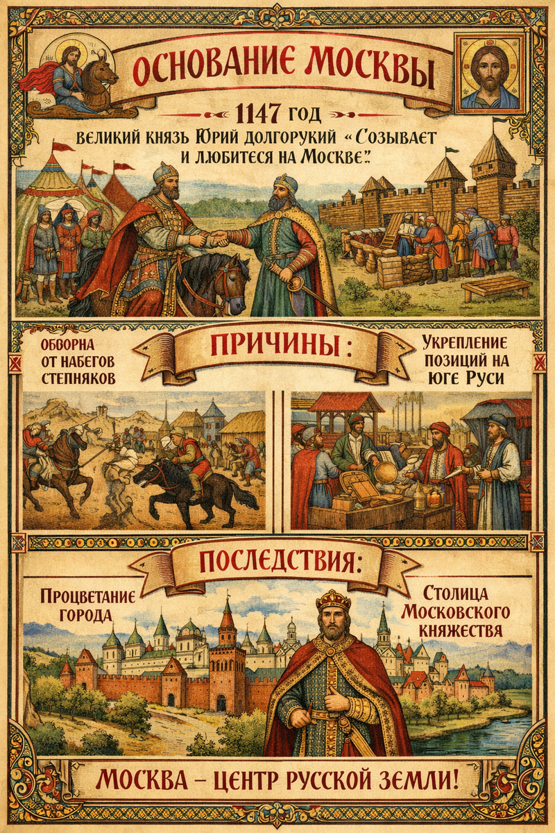 В лето 6655 от сотворения мира, при княжении благовернаго Юрия Владимировича, прозваннаго Долгоруким, бысть в земле Ростово-Суздальстей место лесно и блатно, на высоком бору над рекою Москвою. И видев князь, яко место то крепко есть: вода окрест, леса глухии, пути же торговые и ратные сходятся от Смоленска и Чернигова, и от Новагорода к Рязани, — помысли поставити град, да будет опора земле и страж рубежей. И посла князь слово к Святославу Ольговичу: «Приди ко мне, брате, в Москов». И снидошася они тамо, и совещаша о мире меж князьями и о силе ратной против супостат. Тогда же повеле Юрий срубити острог, и рвы копати, и вал насыпати, и посад устроити; и нарекоша место то градом Москвою, по имени реки. И начаша стекатися люди: кто от дани бежа, кто земли и защиты иска, кто ремесло свое нес. Причины же основанию быша три: во-первых, да утвердится власть княжая на границе леса и степи; во-вторых, да держатся переходы и перевозы речныя, и дань собиратся без ущерба; в-третьих, да будет узел