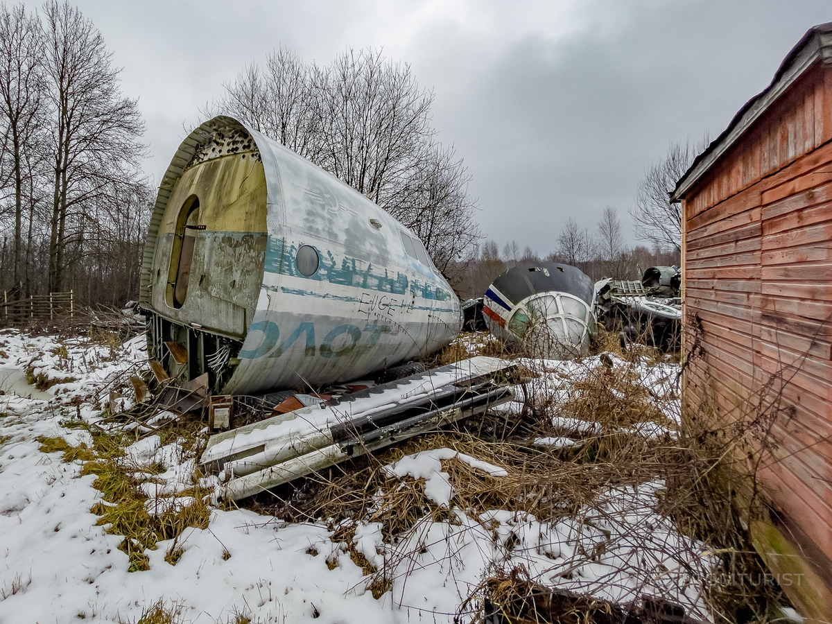 Однажды, путешествуя по безграничным просторам Подмосковья на моём автомобиле, я увидел нечто большое, напоминающее деталь настоящего самолёта. Думал, что мне показалось, но нет. Я пригляделся и понял, это был не муляж и не декорация, это была передняя часть фюзеляжа самого настоящего самолета Ан-12 с выцветшей надписью «Аэрофлот». Я был, откровенно говоря, шокирован, потому что это самый странный огород за баней, который я видел, а видел я огородов за банями очень много. Я подъехал ближе и понял, что передо мной Ан-12. Тот самый тяжелый транспортный самолет, четырехмоторный винтовой работяга, который когда-то поднимался в небо с таким видом, будто ему все равно, сколько тонн внутри. А теперь он лежит здесь, среди берез и заборов, распиленный и раздербаненный на секции, как будто его собирались сложить обратно, но отвлеклись на чай. Носовая часть с огромным остеклением смотрит прямо в деревенскую реальность, где максимум летающего — это пакет с мусором в ветреный день. Возле дома с