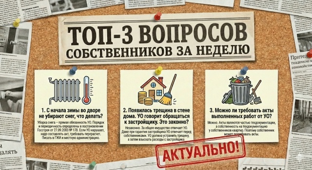 Посмотрим на топ-3 вопросов от собственников за неделю и дадим комментарии. Уборка снега - прямая обязанность управляющей организации. Порядок уборки, периодичность определены в постановлении Госстроя от 27.09.2003 №170. Если УО нарушает порядок, периодичность, то надо составлять акт, требовать перерасчет. Сразу же надо писать в ГЖИ. Не помешает написать и в местную администрацию, так как УО должна соблюдать и местные правила благоустройства, в которых обычно пишут и про уборку снега. Незаконно. За общее имущество отвечает УО. Даже если сохраняется гарантия застройщика – УО все равно отвечает перед собственниками. Гарантия застройщика - это его обязанности перед собственниками по договору долевого участия. А обязанности УО - это обязанности по прямому указанию закона. Это разные правоотношения, смешивать их нельзя. УО должна устранить трещину, а затем может взыскать расходы с застройщика. Можно. К сожалению, в законе это прямо не написано. Однако акты являются частью техдокументации, а
