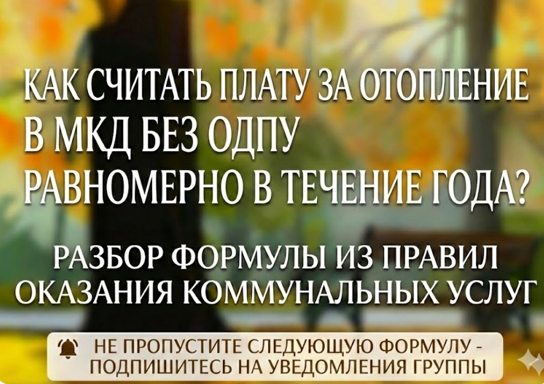1️⃣Когда применяется формула: плата за отопление в доме без ОДПУ равномерно в течение года (формула 2.4 приложения 2 к постановлению Правительства от 06.05.2011 №354). 2️⃣Когда НЕ применяется формула: 1) к оплате за отопление в доме с ОДПУ; 2) к оплате за отопление в доме без ОДПУ в течение отопительного сезона. Подписывайтесь на канал "ЖКХ: вопросы и ответы" и приводите сюда друзей и соседей. 3️⃣В каких помещениях применяется: жилое или нежилое помещение в многоквартирном доме. 4️⃣Условие применения: 1) в многоквартирном доме нет ОДПУ; 2) оплата осуществляется равномерно в течение года. 5️⃣Какие данные нужны для расчета: 1) объем потребления отопления в помещении; 2) общая площадь помещения; 3) общая площадь помещения, входящих в состав общего имущества; 4) общая площадь всех жилых и нежилых помещений в доме; 5) общая площадь помещений, в которых отсутствуют отопительные приборы; 6) норматив потребления для отопления; 7) коэффициент периодичности внесения платы; 8) тариф на отопление