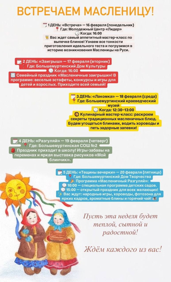 ! Зима уходит, а это значит — пора печь блины, водить хороводы и веселиться от души! Мы подготовили для вас насыщенную программу на каждый день. Сохраняйте расписание, чтобы ничего не пропустить! 👇 🗓 1 ДЕНЬ: «Встреча» — 16 февраля (понедельник) 📍 Где: Молодежный Центр «Лидер» 🕓 Когда: 16:00 👨🍳 Вас ждет самый аппетитный мастер-класс по выпечке блинов! Узнаем все тонкости приготовления идеального теста и погрузимся в историю возникновения Масленицы на Руси. 🗓 2 ДЕНЬ: «Заигрыш» — 17 февраля (вторник) 📍 Где: Большемуртинский Дом Культуры 🕓 Когда: 16:00 👨👩👧👦 Семейный праздник «Масленичные заигрыши»! В программе: веселые эстафеты, конкурсы и игры для детей и взрослых. Приходите всей семьей! 🗓 3 ДЕНЬ: «Лакомка» — 18 февраля (среда) 📍 Где: Большемуртинский краеведческий музей 🕓 Когда: 12:30–13:00 🥘 Кулинарный мастер-класс: раскроем секреты традиционных масленичных блюд. Будем угощаться блинами, водить хороводы и петь задорные запевки! 🗓 4 ДЕНЬ: «Разгуляй» — 19 феврал
