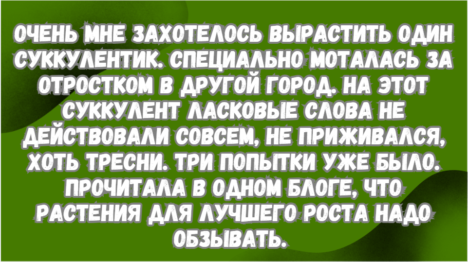 Боюсь, что алоэ скоро захватит дом. Гибискус уже с меня ростом. Зимой наряжаем его вместо елки. Периодически пытаюсь отчекрыжить все лишнее, но жалко до слез. © Изяслав в ярости / ADME - Очень мне захотелось вырастить один суккулентик. Специально моталась за отростком в другой город. На этот суккулент ласковые слова не действовали совсем, не приживался, хоть тресни. Три попытки уже было. Прочитала в одном блоге, что растения для лучшего роста надо обзывать. Попробовал — и ведь растет, не сохнет, веточки-листочки выпускает! © Мурра / ADME