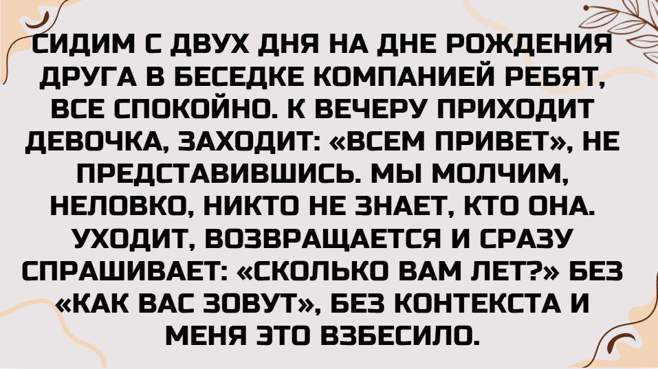 - Сидим с двух дня на дне рождения друга в беседке компанией ребят, все спокойно. К вечеру приходит девочка, заходит: «Всем привет», не представившись. Мы молчим, неловко, никто не знает, кто она. Уходит, возвращается и сразу спрашивает: «Сколько вам лет?» Без «как вас зовут», без контекста и меня это взбесило. Я: «27». Она: «Выглядишь на 15». Мы: «А тебе?» «25». Я: «Ну ты тоже на 15 тянешь». Может, это только мне показалось, но как будто странная энергия. © aida_sanpina