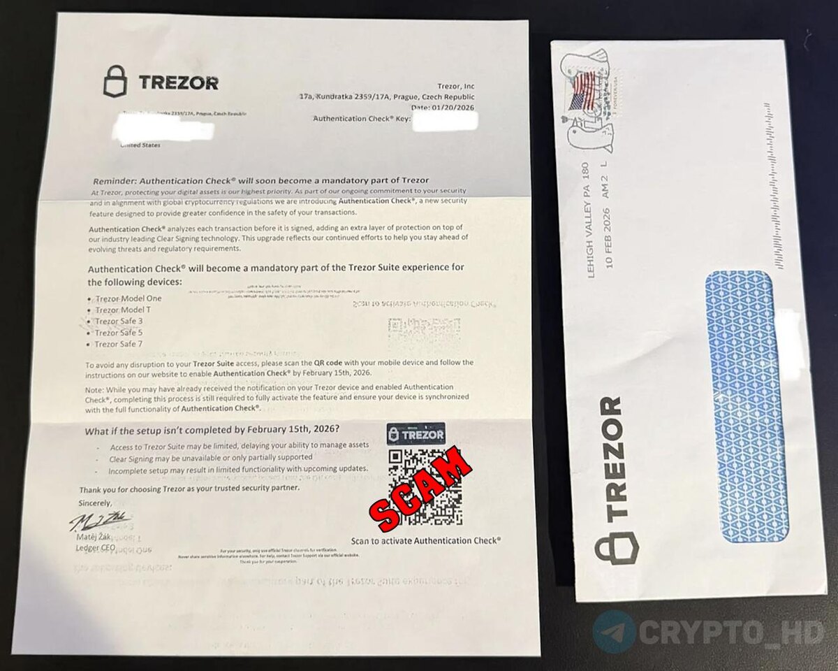 ⚠️ На пользователей Trezor началась почтовая скам-атака. Владельцы холодных кошельков Trezor получают бумажные письма с требованием срочно пройти «проверку аккаунта». ⊹ Письма выглядят как официальные уведомления службы безопасности. ⊹ Внутри размещен QR-код — переход ведет на фишинговый сайт. ⊹ Ввод seed-фразы приводит к полной потере средств. ⊹ Вероятно, используются базы клиентов из прошлых утечек данных. Ранее: Ledger Crypto Headlines