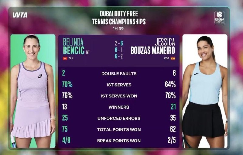⚡ Белинда Бенчич победила Джессику Боусас Манейро в первом круге WTA 1000 Dubai со счетом 2-6, 6-1, 6-2 💪