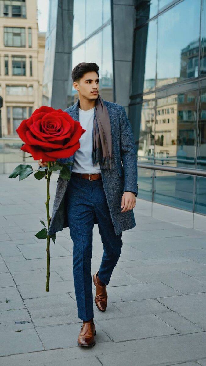 😊😊😊😊😊⬇️ Промт для создания картинки ⤵️ Full-length man, aged 30–40, European appearance, well-groomed, walking along a modern city sidewalk among neat buildings. He is dressed stylishly: a long coat, straight trousers, leather shoes, and a scarf. In his hands, he holds a gigantic fresh flower — a scarlet rose or a peony with an extremely long, thickened stem and large petals; the flower is unusually big, almost as tall as the man himself. His expression is focused, as if searching for something, glancing to the sides. Photorealism, morning urban atmosphere, soft natural daylight, gentle shadow beneath his feet, shot from a low angle, background slightly blurred, with accent on the sharpness of the flower and clothing details. Camera: Sony Alpha 7R IV, 35mm f/1.8 lens. Natural color palette, no excessive filters. Style: real-life city photography, glossy look. Делала в нейросетях➡️ тут Обучение работе с нейросетями ➡️ тут
