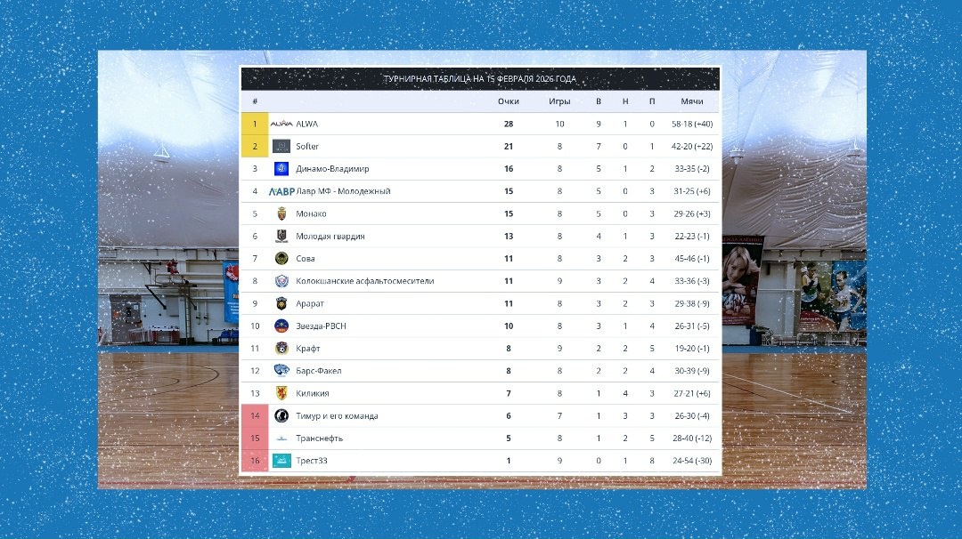 2-я лига. Зона Б 📅 Турнирная таблица на 15 февраля 2026 года 🆚 Команда ALWA вчера минимально обыграла Крафт (1:0) и продолжает возглавлять таблицу. В ближайшую субботу ALWA предстоит сразиться с «Колокшанскими асфальтосмесителями», которые вчера более уверенно (6:4) обыграли Трест 33. У Трест 33 по-прежнему ни одной победы в этом сезоне. ⚔ В субботу также состоится матч претендентов на медали Softer – Динамо-Владимир. https://befutsal.ru/league.php?l=224668564