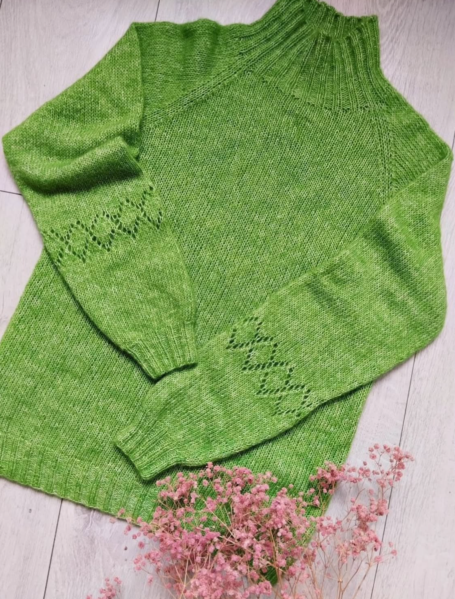Этот свитер «Лайм» вяжется снизу вверх методом реглана. Это отличная модель: классический крой с изюминкой в виде ажурного узора на рукавах. Вяжется по кругу до подрезов.