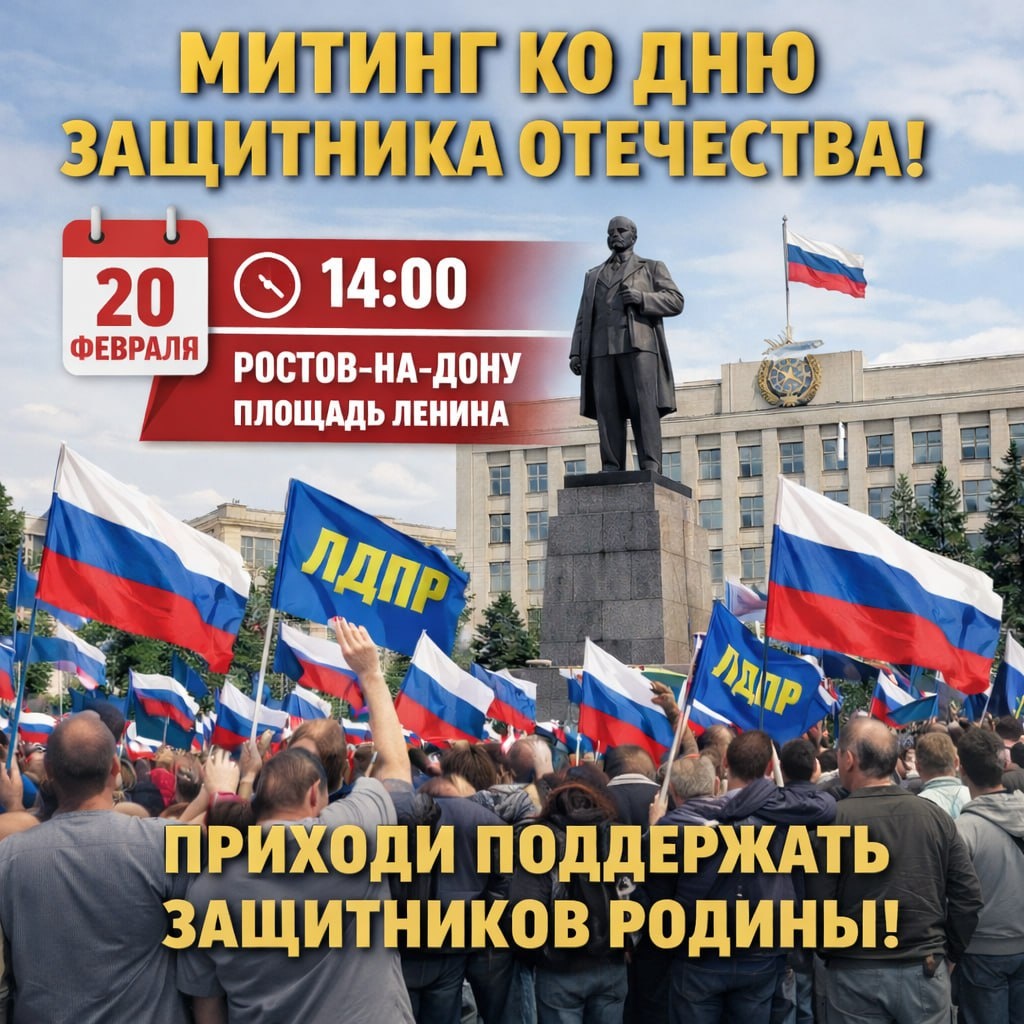 ✨✨✨ Ростовское региональное отделение ЛДПР приглашает жителей донской столицы принять участие в митинге, посвящённом Дню защитника Отечества. 🔹 Митинг состоится 20 февраля в 14:00 на площади Ленина в Ростове-на-Дону. Этот день — символ мужества, силы духа и верности Родине. Мы чествуем всех, кто защищал и продолжает защищать интересы нашей страны, кто стоит на страже безопасности и независимости России. 🔹 Партийцы, активисты и сторонники ЛДПР вместе с жителями города соберутся, чтобы выразить уважение защитникам Отечества и сохранить традицию чествования воинов. ❗Проявим гражданскую позицию и вместе скажем слова благодарности тем, кто служит Родине. Будем рады видеть каждого из вас! Дорогие подписчики, благодарим Вас за поддержку! Ваши реакции, приглашения друзей и репосты позволяют нам развиваться. Не забывайте ставить 👍👍👍