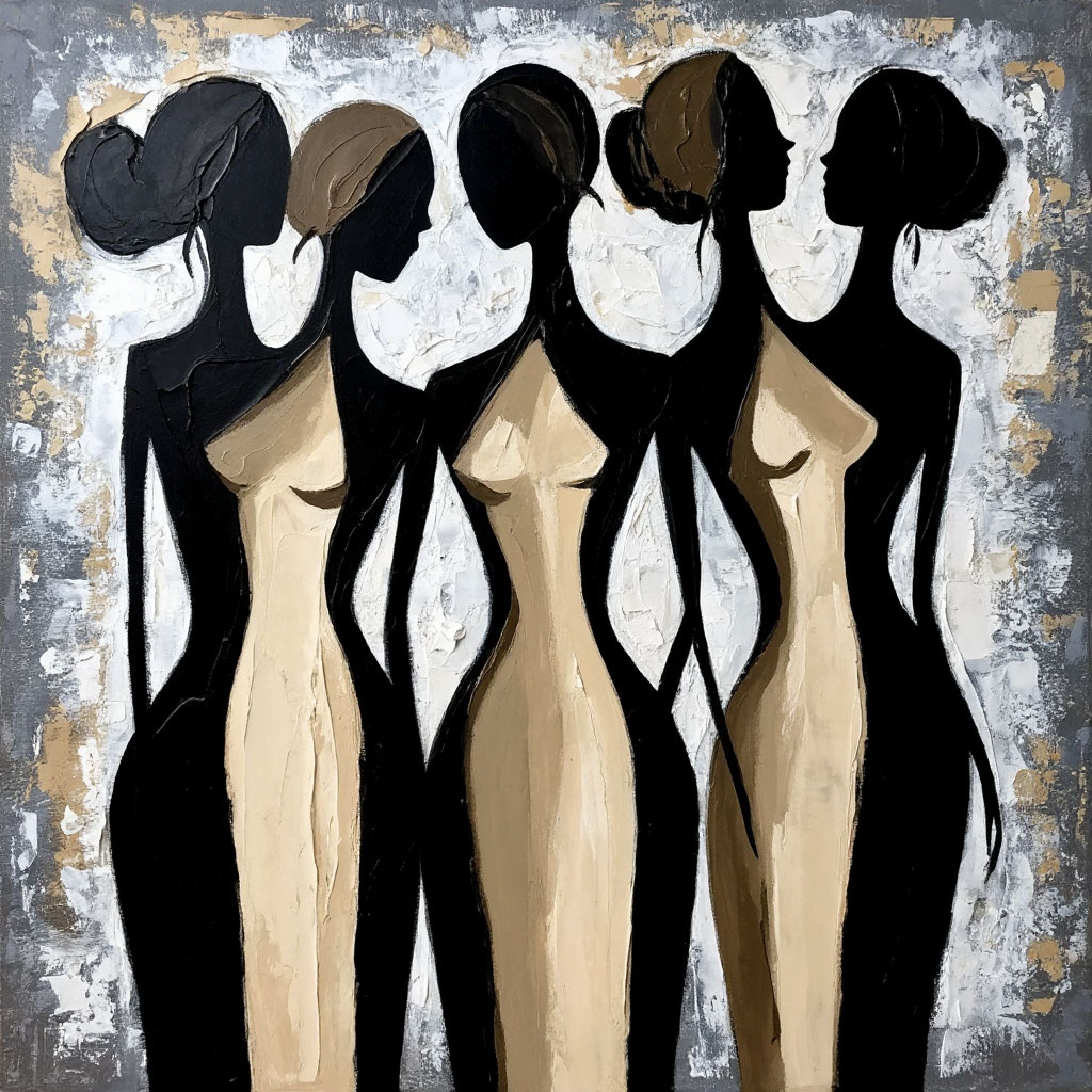Промт 5: Монохромная версия с акцентом золота: Пять элегантных вытянутых женских силуэтов, черные фигуры и светло-бежевые торсы на фоне фактурной стены с золотыми акцентами, монохромная палитра с бронзовыми отблесками, стиль модерн/экспрессионизм, толстая текстура, освещение слева, формат 1:1. Параметры: --v 5 --q 2 --ar 1:1 --stylize 900
