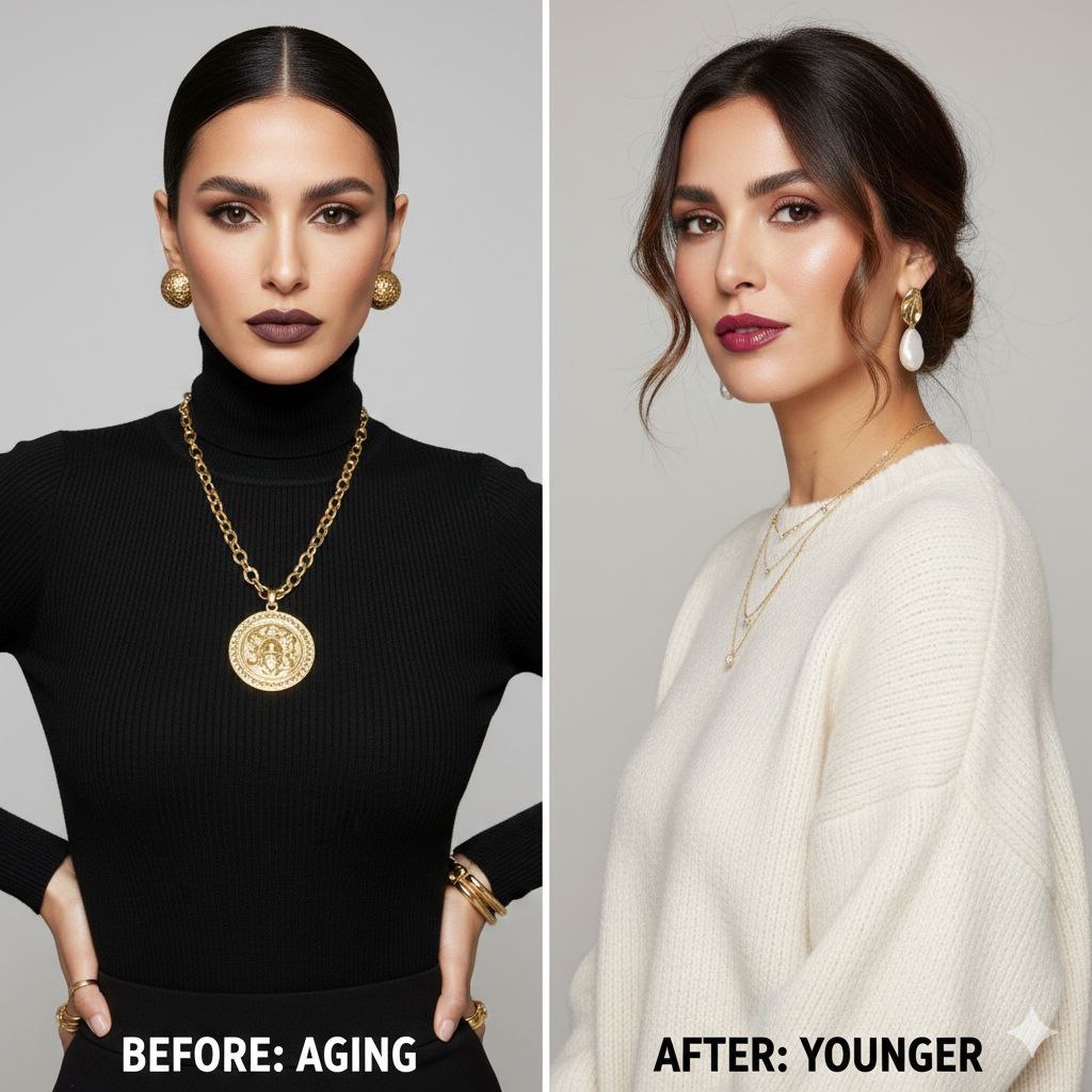 Чем заменить: Плотным хлопком или трикотажем, который держит форму. Оверсайз или просто свободное прилегание — наши лучшие друзья. 2. Обилие «статусного» золота Массивные золотые гарнитуры (серьги + кольцо + кулон из одного набора) добавляют весу не только вашему кошельку, но и возрасту. Это выглядит слишком консервативно и «тяжело».