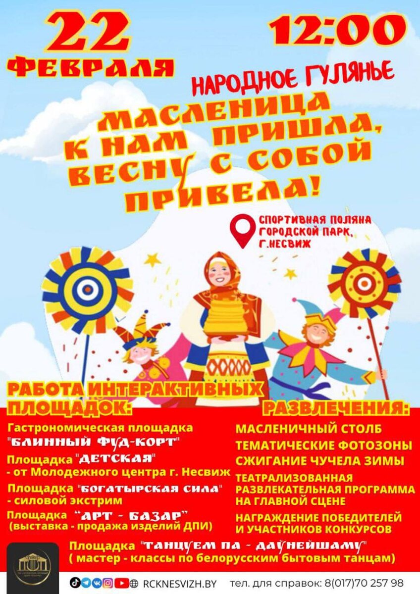 🔥 22 ФЕВРАЛЯ | 12:00 СПОРТИВНАЯ ПОЛЯНА, Несвижский городской парк МАСЛЕНИЦА К НАМ ПРИШЛА, ВЕСНУ С СОБОЙ ПРИВЕЛА! ✔️ Главные площадки и развлечения: 🔹 Открытый чемпионат по приготовлению блинов «аЛАДНЫ ФЭСТ»; 🔹 Гастрономическая площадка: «Блинный фуд‑корт», теплые угощения. 🔹 Масленичный столб: соревновательная программа и призы. 🔹 Тематические фотозоны — зимние и весенние мотивы. 🔹 Площадка «Детская» — игры для детей (от Молодёжного центра, г. Несвиж) 🔹 Театрализованное сожжение чучела зимы. 🔹 Площадка «Богатырская сила» — силовой экстрим, состязания. 🔹 Площадка «Арт‑базар» — выставка‑продажа изделий декоративно‑прикладного искусства. 🔹 Награждение победителей конкурсов. 🔹 Площадка «Танцуе па-даунейшаму» — мастер‑классы по белорусским бытовым танцам от РЦНТ. 👉 ЖДЁМ ВАС!