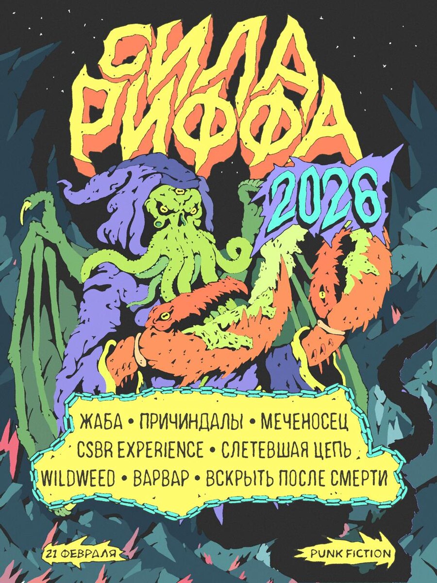 #black #doom #jazz #metal #noise #post #psychedelic #punk #rock #sludge #stoner ► СИЛА РИФФА 2026 ● TG ● VK Ежегодный зимний фестиваль тяжелой психоделической музыки для набора веса от московского лейбла-сообщества CSBR. Везём стены звука, киловатты света, топ лайнап Участники: ► Вскрыть После Смерти ● TG ● VK ► Wildweed ● TG ● VK ► Жаба ● TG ● VK ► CSBR Experience ● TG ● VK ► Варвар ● TG ● VK ► Причиндалы ● TG ● VK ► Слетевшая Цепь ● VK ► Меченосец ● TG ● VK Билеты от 800₽