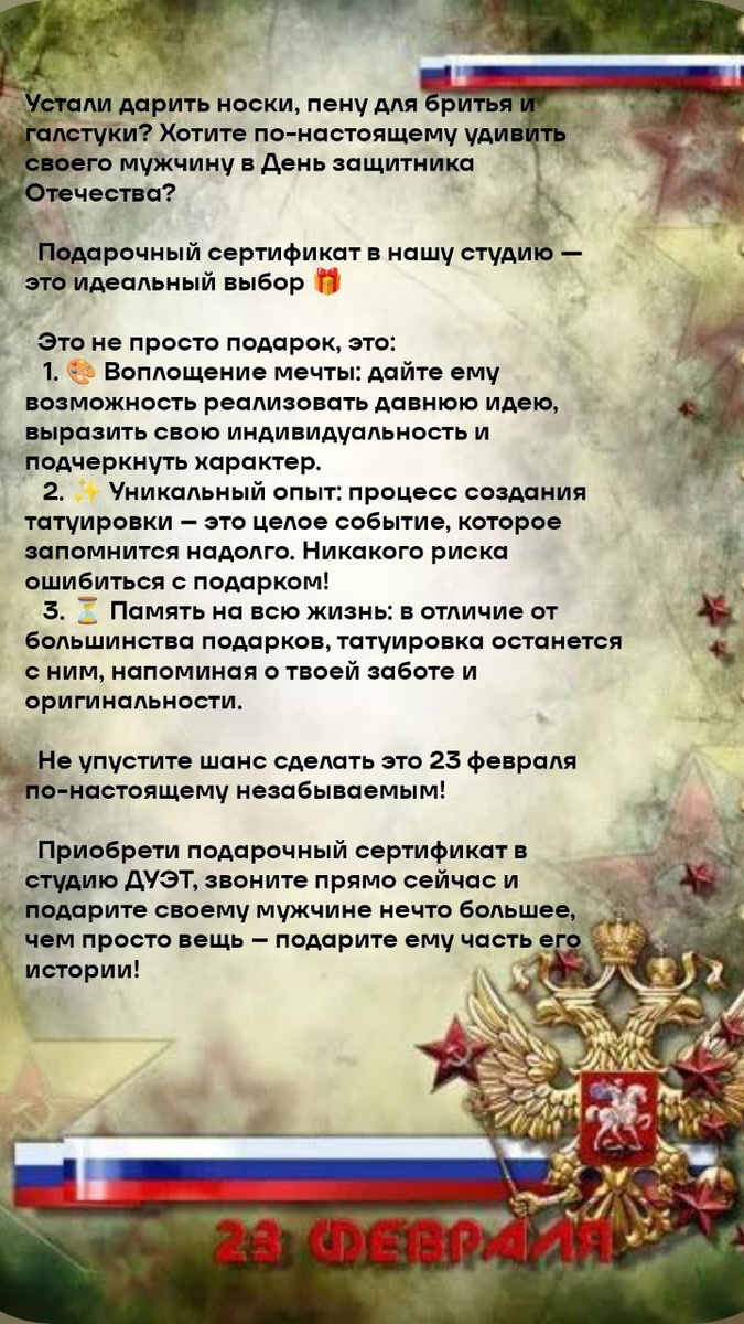 # 23 февраля: Подарите ему искуство, которое останется навсегда! от тату-студии ДУЭТ 💪 Устали дарить носки, пену для бритья и галстуки? Хотите по-настоящему удивить своего мужчину в День защитника Отечества? Представьте: он давно мечтает о татуировке, но всё никак не решается или откладывает? Или, может быть, у него уже есть тату, и он готов к новому шедевру? Подарочный сертификат в нашу студию это идеальный выбор 🎁 Это не просто подарок, это: 1. 🎨 Воплощение мечты: Дай ему возможность реализовать давнюю идею, выразить свою индивидуальность и подчеркнуть характер. 2. ✨ Уникальный опыт: Процесс создания татуировки – это целое событие, которое запомнится надолго. 3. 🛡️ Символ силы и стиля: Татуировка – это мощный способ самовыражения, отражающий внутренний мир и мужественность. 4. 💯 Полная свобода выбора: С нашим сертификатом он сам выберет эскиз, стиль чтобы воплотить его идею в жизнь. Никакого риска ошибиться с подарком!