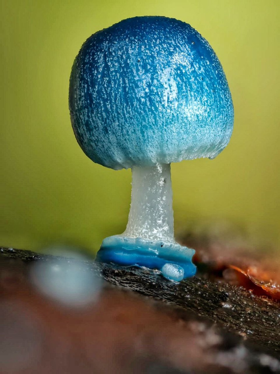 ) 🍄🟫 Этот гриб является одним из прекраснейших представителей своего царства на Земле. Его ярко-голубой окрас и прозрачность делают его похожим на декорацию из научно-фантастического фильма. Расположенный на изящной искривленной ножке, он притягивает взгляд своей необычной красотой. 💙 Несмотря на отсутствие способности излучать свет в темноте, присущую некоторым родственникам, этот экземпляр сохраняет свою магическую привлекательность и уникальность.