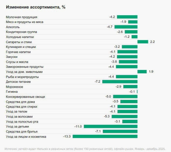 «Этот фактор вносит отрицательный вклад в развитие продаж почти во всех сегментах рынка товаров повседневного спроса», - отмечают в «Нильсен». (данные - «Результаты года и вектор рынка в 2026. Обзор ключевых цифр, драйверов, спроса и перспектив», «Нильсен», февраль 2026) Подписаться на нас