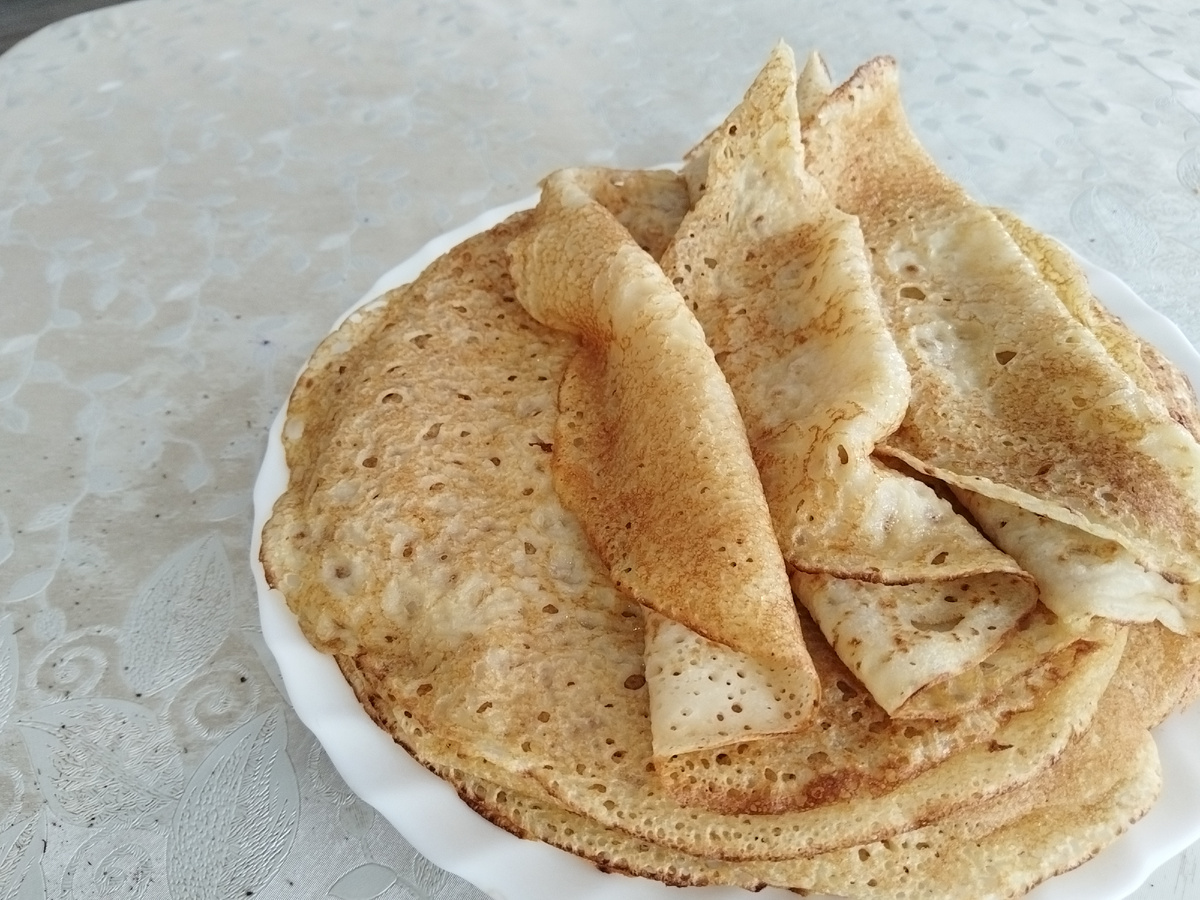 **Ингредиенты:** - молоко — 250 мл, - крутой кипяток — 250 мл, - яйца — 2 шт., - мука — 160 г, - растительное масло — 2 ст. л., - сахар — 1 ст. л., - сода — 0,5 ч. л., - соль — щепотка. **Приготовление:** 1. Взбейте яйца с сахаром и солью. 2. Добавьте молоко комнатной температуры и муку, перемешайте до гладкости. 3. Влейте тонкой струйкой кипяток, интенсивно размешивая тесто. 4. Добавьте соду и масло. 5. Сразу начните жарить — пузырьки воздуха сделают тесто пористым. **Совет:** молоко и яйца достаньте из холодильника за полчаса до готовки. Тёплые продукты лучше соединяются, и тесто получается однородным. Консистенция должна напоминать жидкую сметану.