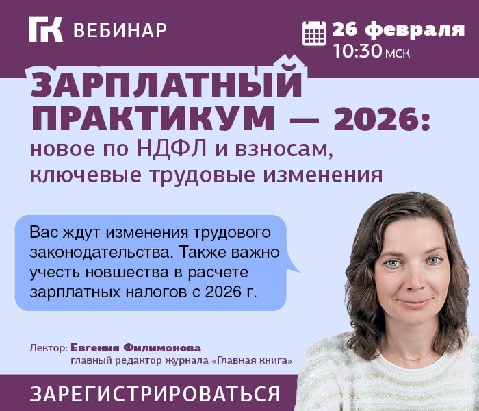 ? ⛔️ Миф: можно не платить вмененные взносы с МРОТ за руководителя, если он в длительном отпуске за свой счет или на больничном🤒 💡 Правда: можно не платить вмененные взносы за руководителя, если передать управление юрлицом предпринимателю-управляющему. Эту болезненную тему разберем ОТ и ДО 💼 на зарплатном практикуме — 2026, который проведет главный редактор журнала «Главная книга» Евгения Филимонова. Дата и время: 26 февраля, 10:00 МСК. ❗️Напоминаем, что завтра заканчивается скидка на раннюю регистрацию: 🔥3202 4575 рублей с НДС (прямой эфир), 2135 3050 рублей с НДС (доступ к записи). Подписчики журнала «Главная книга» участвуют бесплатно. ➡️ Зарегистрироваться со скидкой