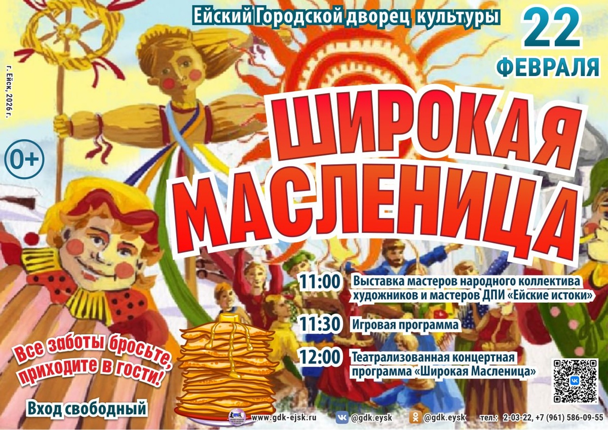 🥞 В Прощённое воскресенье, 22 февраля в 12:00, приглашаем в Ейский городской дворец культуры на праздник «Широкая Масленица» ☀️ ❗️Вход свободный. Количество мест ограничено❗️ В этот день для Вас приготовлено много интересного: 🖇 11:00 - выставка – ярмарка ремёсел от художников и мастеров народного коллектива декоративно прикладного искусства «Ейские истоки»; 🖇 Тематические фотозоны; 🖇 Интерактивные площадки; 🖇 Скоморошьи забавы. 🚀 Подписывайтесь: @gdk_ejsk