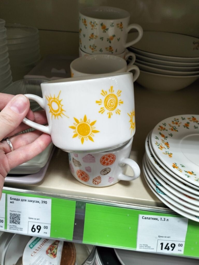 Добрый вечер) Сегодня я опять хочу поделиться интересными новинками из магазина «Фикс Прайс». Для тех, кому нравится этот магазин. Большое спасибо, что зашли) Очень понравились вот такие чашки с солнечными рисунками. Представлены в трех дизайнах с тремя рисунками. Объем у них 220 мл. Можно собрать красивый чайный наборчик. Выполнены они из фарфора. Цена всего 69 рублей. Также к таким чашкам можно подобрать чайное блюдце, как раз подходящее по рисунку к чашке. Тогда точно получится милый набор. Тоже выполнено из керамики, а цена 69 рублей. Ниже приложила фото, которые сделала в магазине. Красивый набор салатников на подставке. Не стала вытаскивать в магазине из коробки. Но ниже есть фото с сайта «Фикс Прайс». В набор входит три салатника по 260 мл каждый и деревянная подставка для них. Выполнены салатники из фарфора. Прекрасно подойдут для сладостей, орехов, печенья, закусок. Такой набор можно подарить на праздник. Выглядит красиво. Цена 349 рублей. В новой коллекции снова пополнение. П