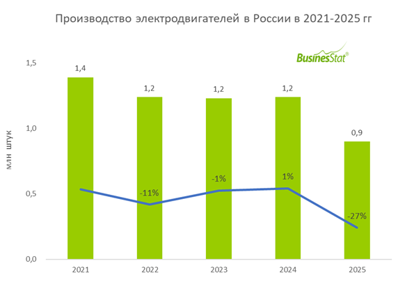 В 2025 г производство электродвигателей в России сократилось на 28%: с 1,2 до 0,9 млн шт