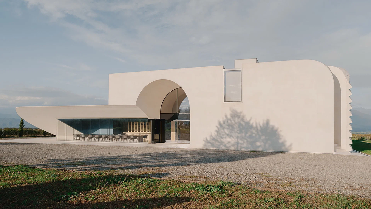 Архитектурная лаборатория №3 переосмыслила винодельческое наследие Грузии, возведя винодельню «Вачнадзиани» в окружённой горными склонами долине Алазани. Проект включает в себя действующее здание винодельни, небольшой отель, конференц-залы и ресторан. Главный фасад, напоминающий футуристичное здание из далёкого будущего, обращён к водохранилищу. Его монолитные каменные формы, пересечённые арочными проёмами, создают необычную игру форм и пустот. Массивные объёмы подчёркивают прочную связь с землёй, а выступающие элементы архитектуры, наоборот, создают ощущение невесомости. Сдержанная монохромная палитра внутри задаёт спокойную и интимную атмосферу. Со стороны винодельня напоминает элитный жилой комплекс, а не промышленный объект. Кажется, будто это шикарная вилла какого-то миллионера, а не действующее производство с прилегающим мини-отелем. Фото: Grigory Sokolinsky Что вам нравится в Грузии больше всего?