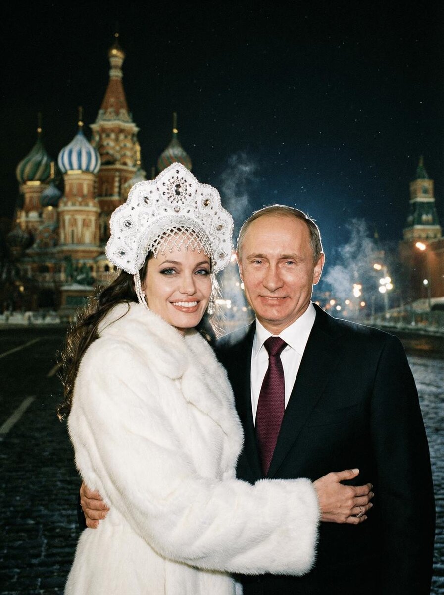 Модель: Nano Banana Сгенерировать🪄 Создай изображение не меняя черты лица.портрет в полный рост.на заднем фоне вечерний Кремль, темное,звездное небо,подсветка куполов,зимний воздух.вспышка как у пленочного фотоаппарата -жесткий фронтальный свет.женщина в белой меховой шубе, взгляд направлен в камеру, уверенный с милой улыбкой.белый кокошник с камнями,блеск от вспышки.волосы распущенные волнами.натуральная кожа, пленочная зернистость, легкий макияж. Рядом с женщиной президент Российской Федерации Владимир Владимирович Путин, одет в классический костюм, с белой рубашкой и бордовым галстуком,он приобнимает за талию женщину,смотрит в камеру и мило улыбается.