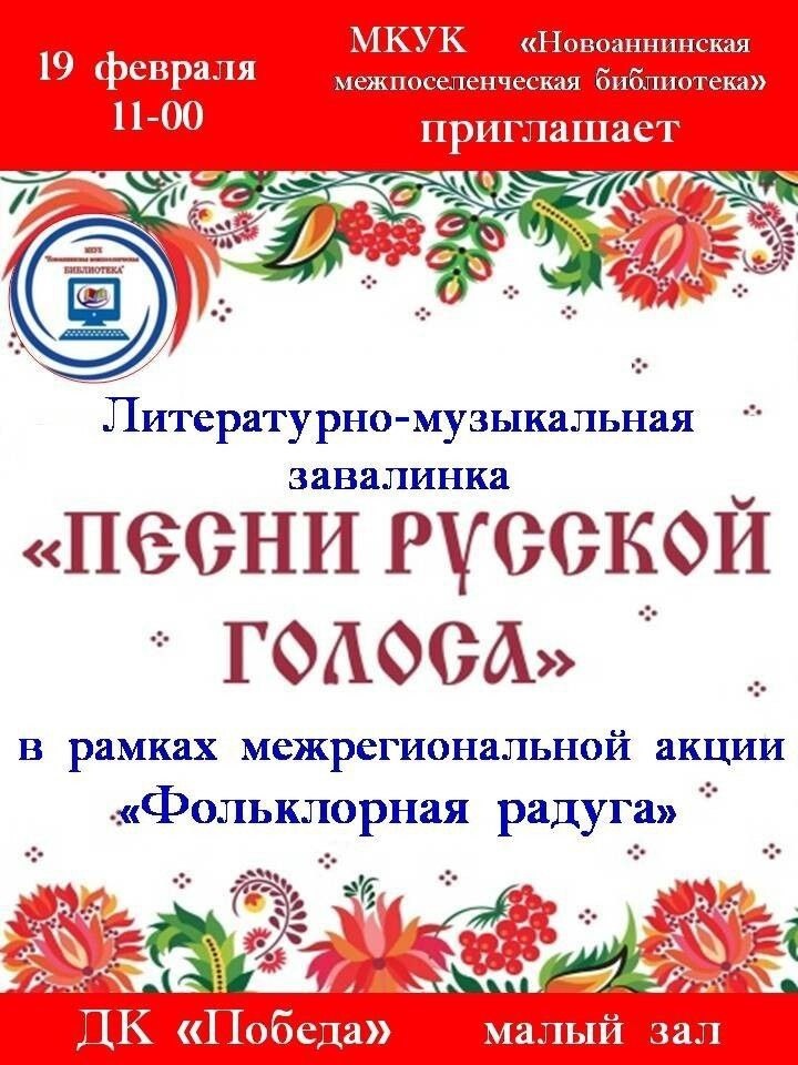 Новоаннинская межпоселенческая библиотека приглашает 19 февраля в 11 часов в малый зал ДК «Победа» на литературно-музыкальную завалинку
