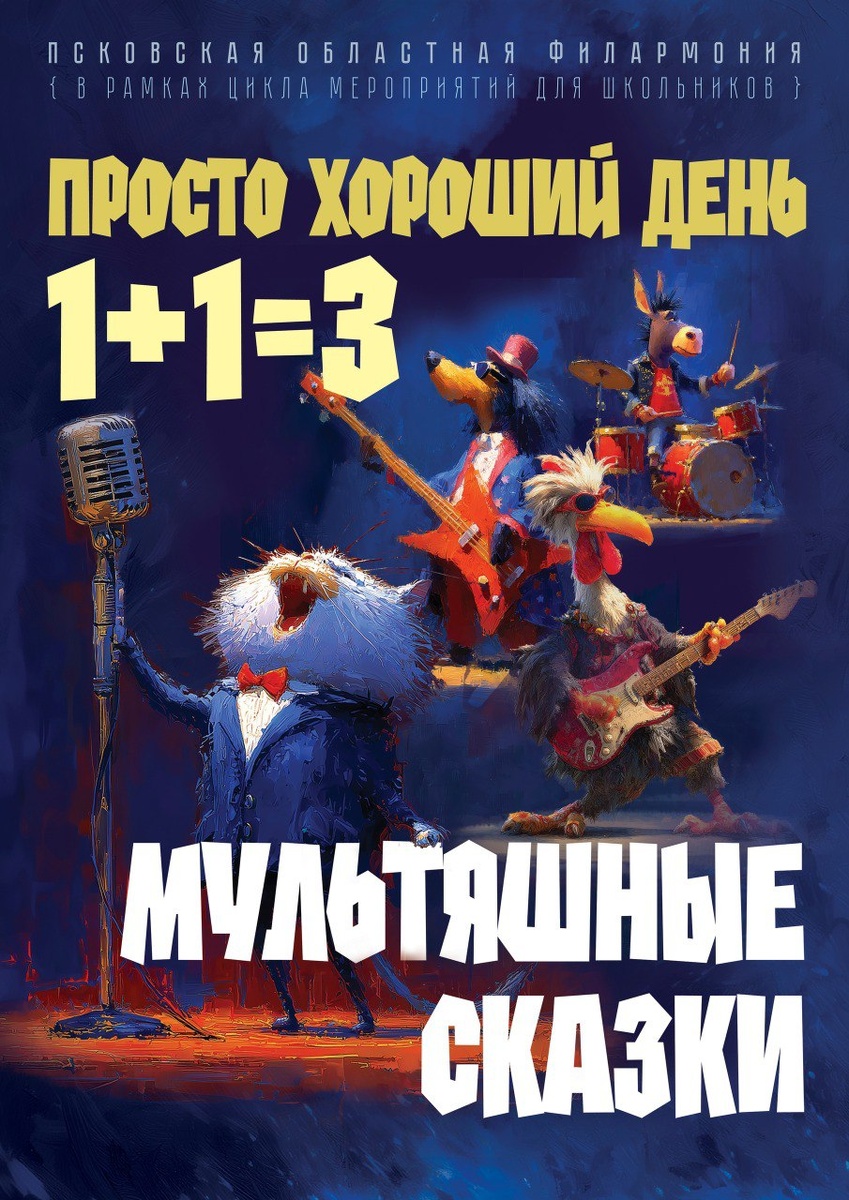 🎶 📍 17 февраля мы запускаем акцию «1 + 1 = 3» на предстоящий концерт «Мультяшные сказки», который пройдёт 19 февраля в Псковской областной филармонии. 🎫 Купите два билета — получите третий в подарок! Отправьтесь со своими близкими в мир любимых мультфильмов. 👉 Приглашаем всех, кто хочет провести время вместе с друзьями, родителями или детьми. Берите любимых и спешите на наш концерт — море позитива гарантировано каждому зрителю! 😄 ❗ВНИМАНИЕ❗ Акция действует 17 февраля 2026 года. Только при покупке билетов в КАССЕ филармонии (Некрасова, 24) по режиму работы кассы (с 11 до 20 часов, с 15 до 16 перерыв). ⚡Подробнее о концерте https://philpskov.ru/afisha/koncert_multyashnye_skazki