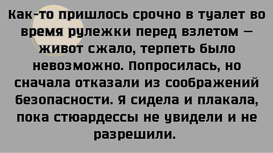 - Как-то пришлось срочно в туалет во время рулежки перед взлетом — живот сжало, терпеть было невозможно. Попросилась, но сначала отказали из соображений безопасности. Я сидела и плакала, пока стюардессы не увидели и не разрешили. Ощущения были невероятные: самолет отрывается от земли, а ты в этом месте. Держалась за стенки, но сердечно поблагодарила за понимание. © julia-sp / ADME