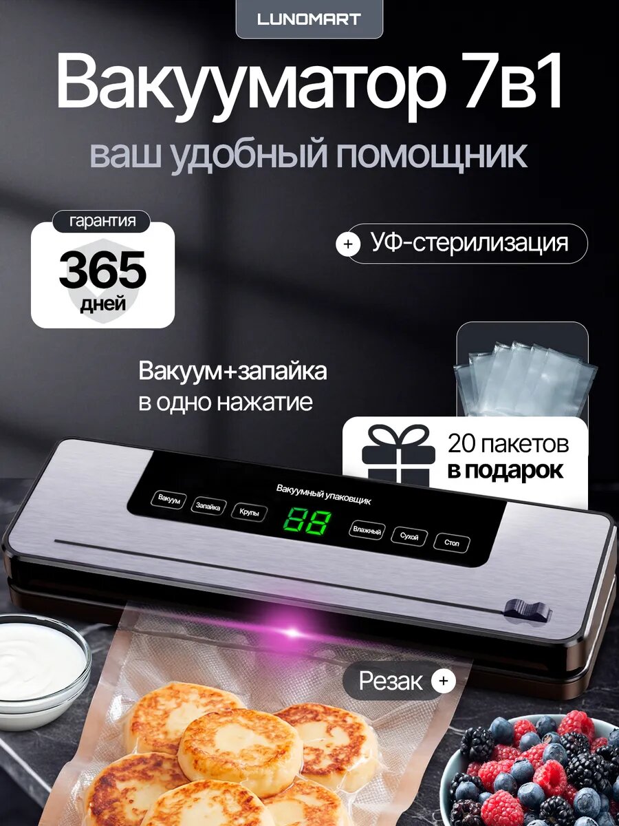 Откройте для себя новый уровень хранения продуктов с нашим вакуумным упаковщиком! Этот инновационный кухонный аппарат не просто сохраняет свежесть - он улучшает функционал вашей кухни, делая хранение продуктов понастоящему долгосрочным. Ручной бытовой прибор для вакуумной упаковки продуктов в доме с электронной панелью на русском языке интуитивно понятен даже тем, кто никогда не использовал подобную технику для упаковки. Наш портативный ваакумуатор - это надежный спасатель вкусов и ароматов ваших блюд. Большая поверхность запаивателя универсальна для выполнения разных задач, а встроенный резак позволяет легко отрезать пакет нужного размера одним движением, избавляя от необходимости использовать ножницы. Встроенный поддон сбора жидкости обеспечивает отсутствие загрязнений. Благодаря качественному вакуум запаивателю, еда при заморозке сохраняют все витамины и нутриенты значительно дольше обычного. Владельцы особенно восхищаются тем, как приятно достать зимой свежие ягоды, которые пахнут