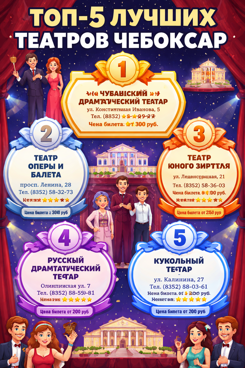 Чебоксары — город, где театральная жизнь бьёт ключом. Здесь есть всё: от академической оперы до экспериментальной пантомимы, от национальной драмы до кукольных сказок. Выбирайте не по названию, а по настроению. Хотите величия и размаха — в оперный. Хотите прикоснуться к культуре — в чувашскую драму. Хотите удивить ребёнка — в кукольный. Хотите чего-то нового — в камерный или экспериментальный.