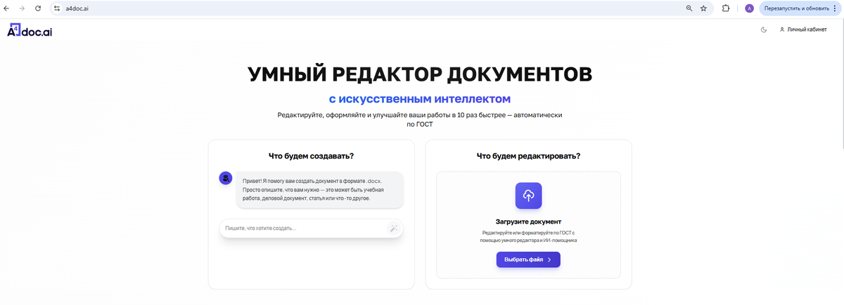 Устали ночами воевать с ГОСТом, полями и «поехавшими» таблицами в Word? A4DOC.AI — онлайн‑редактор документов с ИИ, который берёт на себя оформление, вычитку и переработку текста. Просто загружаете файл, выбираете задачу - и получаете аккуратный, читабельный документ без ручного шаманства. Сервис работает прямо в браузере, поэтому с ним удобно сидеть и с ноутбука, и со старого ПК, и даже с телефона. Открыли сайт https://a4doc.ai/ и сделали. Если тоже страдаете от Word - напишите в комментариях, с чем вы чаще всего мучаетесь: полями, оглавлением или таблицами.