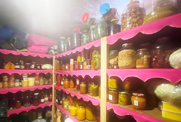 На этой фотографии вы видите нашу кладовую, предназначенную для хранения продовольственных запасов на зимний период. В дополнение к данному помещению, в нашем распоряжении имеется специализированный подвал, где аккумулируются корнеплоды, такие как картофель, морковь, свекла и брюква, а также капуста и батат, что позволяет обеспечить стабильное снабжение продуктами в течение не только холодного сезона.