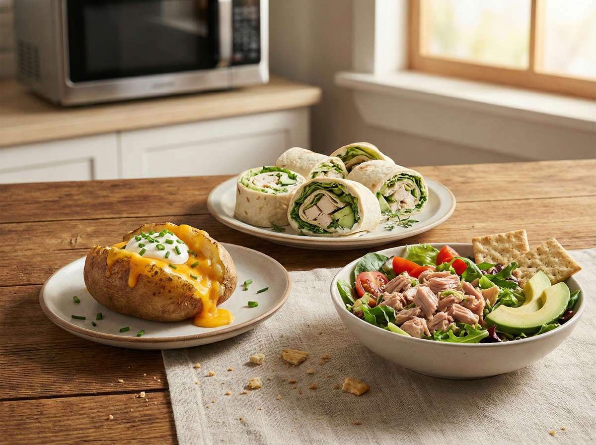 Бывают дни, когда плита не вариант: нет времени, нет сил, жара летом, или вы вообще не дома (офис/общежитие/съёмная кухня). Ниже 10 ужинов, которые можно сделать без плиты: в микроволновке, с чайником или просто “собрать” из готовых продуктов. Получается быстро и вполне сытно.