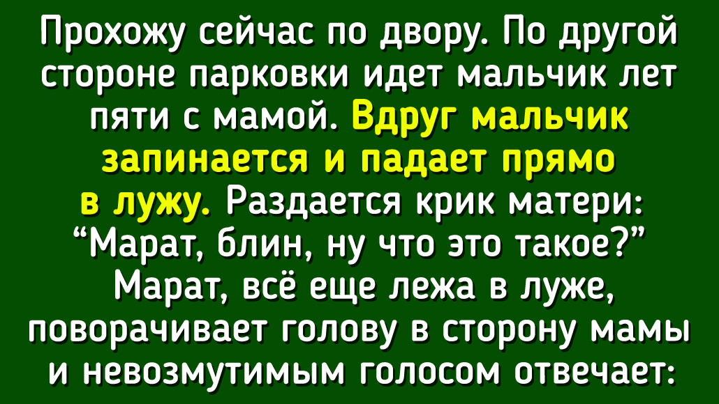 Непосредственность, открытость всему новому и живое воображение помогают нашим отпрыскам находить нестандартные решения в любых жизненных ситуациях и никогда не унывать. Правда, иногда родители тоже выдают весьма достойные перлы. ADME рад, что мы можем посмеяться над собой. Прохожу сейчас по двору. По другой стороне парковки идет мальчик лет пяти с мамой. Вдруг мальчик запинается и падает прямо в лужу. Раздается крик матери.