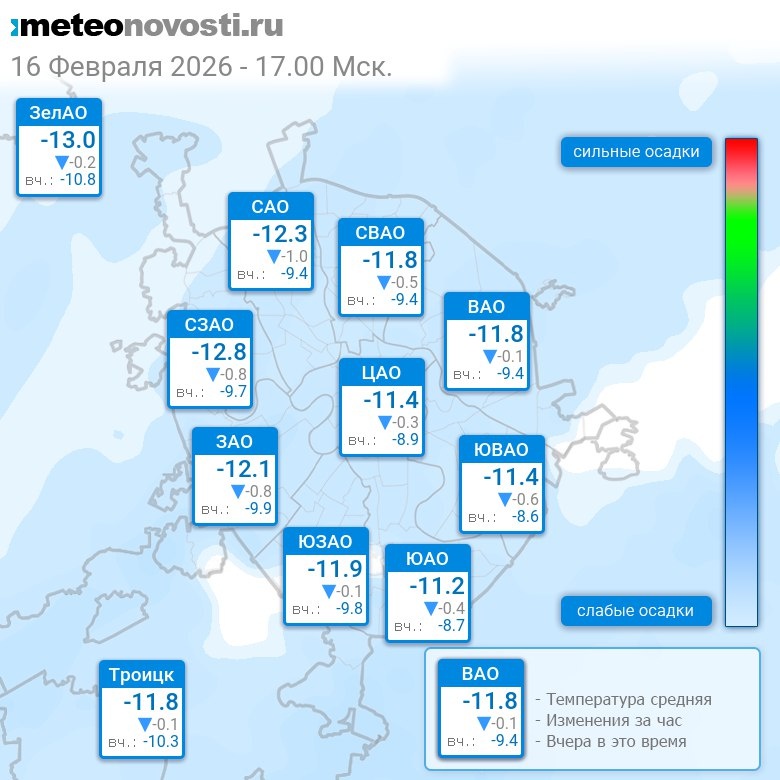 В 17:00 в Москве было от -13.2°C до -10.7°C, средняя температура -11.8°C #погода #Москва #зима #температура #16февраля #понедельник