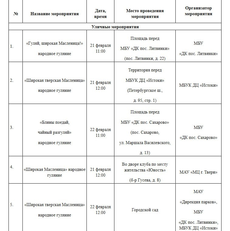 С 16 февраля в учреждениях культуры и молодежной политики начались мероприятия, посвященные празднованию Широкой тверской масленицы. В досуговых центрах, библиотеках семейного чтения, клубах по месту жительства, дошкольных и общеобразовательных учреждениях проходят фольклорные праздники, мастер-классы, интерактивно-развлекательные программы и игры. В воскресенье, 22 февраля, в 12 часов народные гулянья «Широкая тверская Масленица» пройдут в Городском саду. Гостей праздника ждет большой концерт, соревнование по «Бузе» и другие русский традиционные состязания, все желающие могут покорить масленичный столб, на вершине которого будут закреплены подарки. Также развлекательная программа для жителей будет организована на площадках «ДК пос. Сахарово», «ДК пос. Литвинки», ДЦ «Истоки», ДК «Синтетик», «ДК пос. Элеватор», ДК «Затверецкий», ДЦ «Мир» и в Бобачевской роще. Возрастное ограничение 0+ НАШ ИНФОРМАЦИОННЫЙ ПОРТАЛ