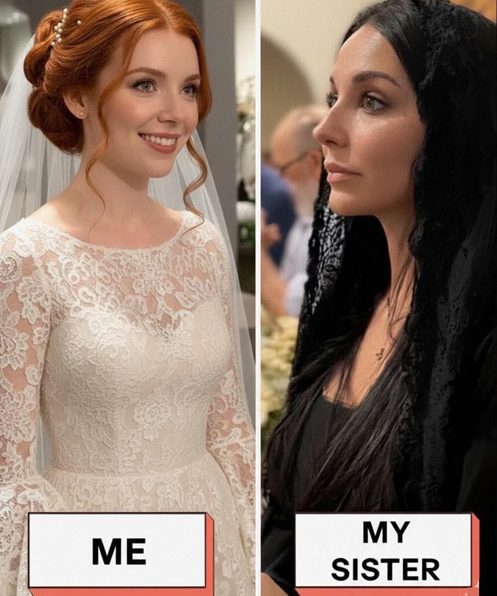 Она стояла рядом с тортом в черном траурном платье, темная вуаль закрывала лицо. Она выглядела так, будто пришла на похороны — а не на свадьбу сестры.